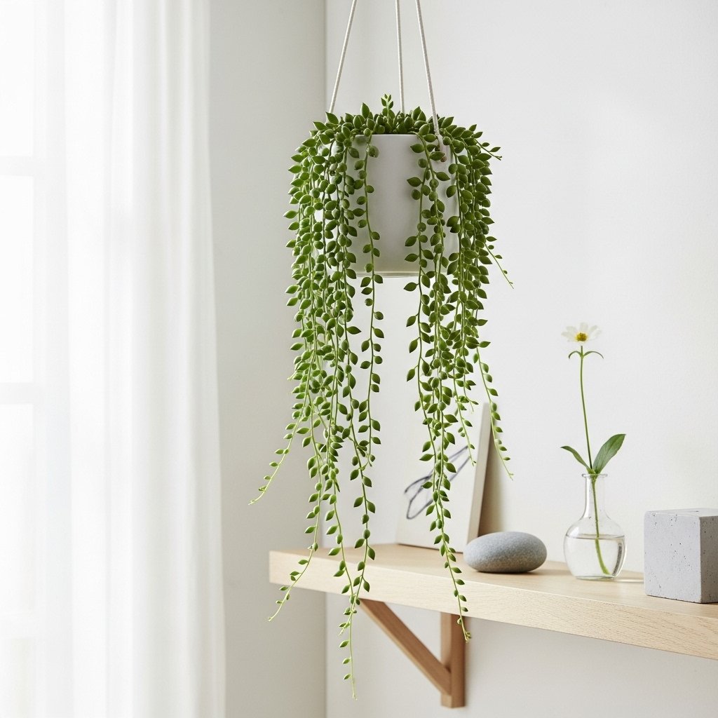 String of pearls is a unique succulent with bead-like leaves that drape beautifully over pots and shelves. Its cascading growth pattern adds texture and charm to small spaces or shelves. This plant thrives in bright, indirect light and minimal watering, making it perfect for low-maintenance aesthetic décor. Pairing it with a hanging planter or a high shelf enhances its visual impact. Its whimsical look is perfect for modern, bohemian, or Scandinavian-style interiors.