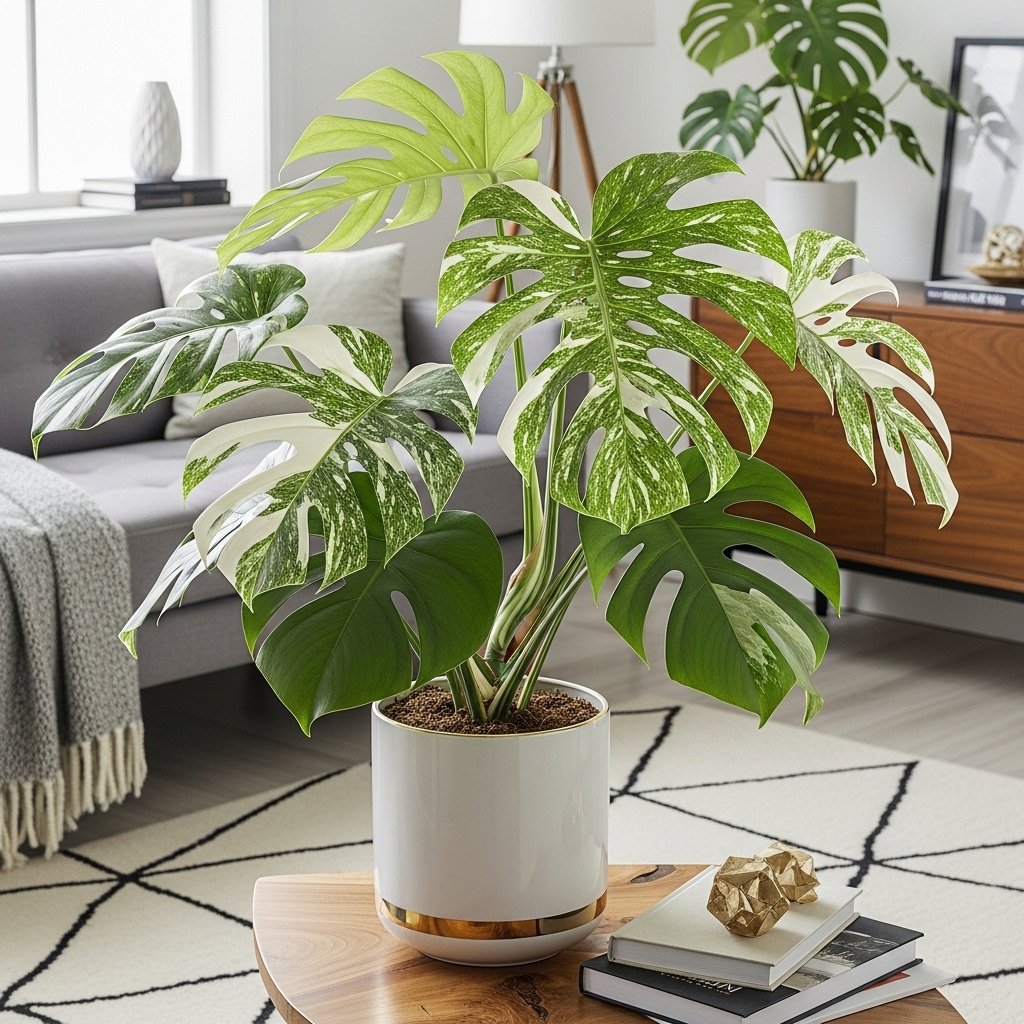 Monstera Thai Constellation is a highly aesthetic plant with marbled white and green leaves that look almost artistic. It adds a modern, high-end feel to any interior space. This plant prefers bright, indirect light and moderate watering to maintain its vibrant foliage. Its unique leaf patterns make it a natural conversation starter in living rooms or offices. Pairing it with a stylish ceramic or gold-accented planter enhances the luxurious, aesthetic vibe.