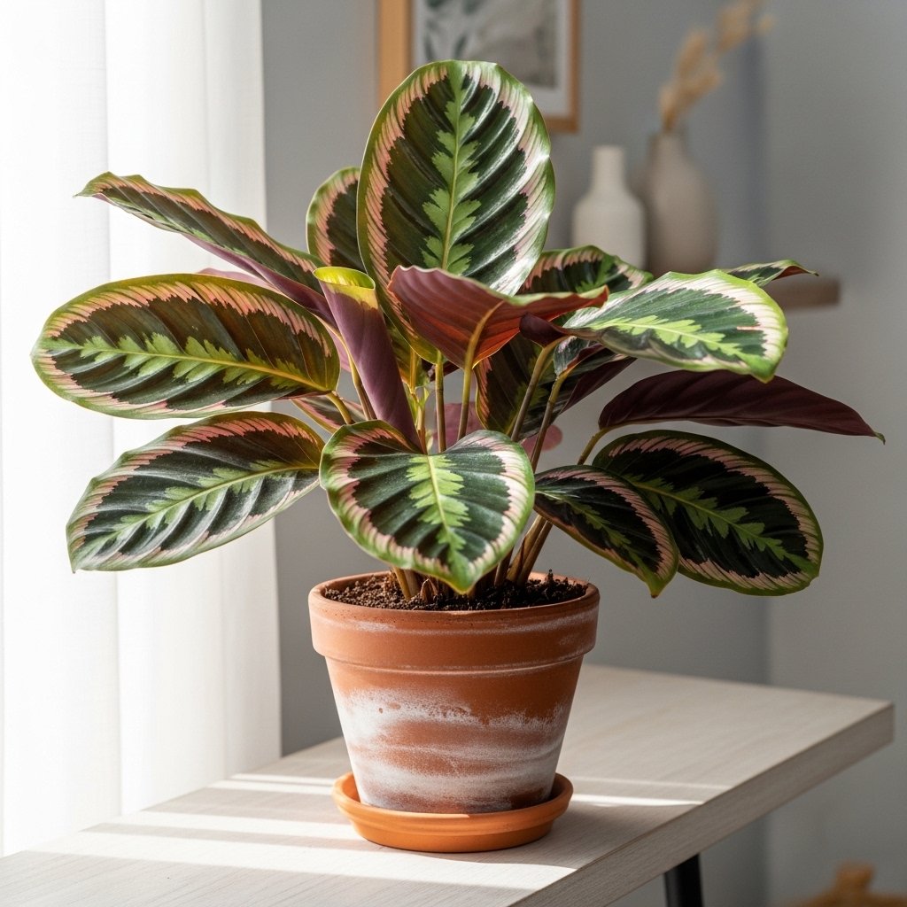 Calathea plants are prized for their vibrant, patterned leaves that resemble art pieces. They come in various varieties, such as Calathea Medallion and Calathea Orbifolia, each with unique leaf designs. Calatheas thrive in moderate light and high humidity, making them suitable for bathrooms or kitchens. Their intricate foliage instantly enhances the beauty and sophistication of a space. Pairing with a neutral or terracotta pot allows the vibrant leaf patterns to stand out.