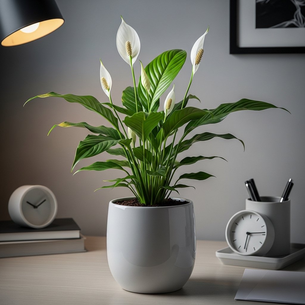 The peace lily is a graceful plant with glossy leaves and elegant white flowers that bloom indoors. It purifies the air, making it both beautiful and functional. Peace lilies thrive in low to medium light, perfect for living rooms, offices, or bedrooms. Its smooth, curved foliage adds a soft, calming aesthetic to modern and minimalist spaces. Placing it in a chic pot elevates its visual appeal, making it a statement piece without being overwhelming.