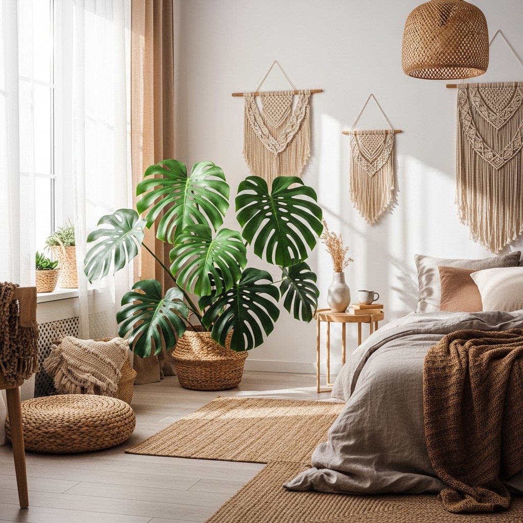 Monstera is a trendy indoor plant known for its large, split leaves. It adds a tropical and stylish look to modern bedroom interiors. This plant grows well in bright indirect light and requires moderate watering. Its bold leaf structure makes it a popular choice for aesthetic bedroom setups. Monstera is ideal for people who want an Instagram-worthy room design.