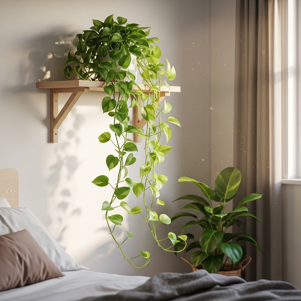 Pothos is one of the most versatile bedroom indoor plants, known for its trailing vines and heart-shaped leaves. It grows well in low light and can be placed on shelves, hanging baskets, or wall planters. This plant requires little maintenance and can survive occasional neglect. Its green and golden leaves add a vibrant touch to bedroom interiors. Pothos is perfect for creating a natural, cascading green effect in small spaces.