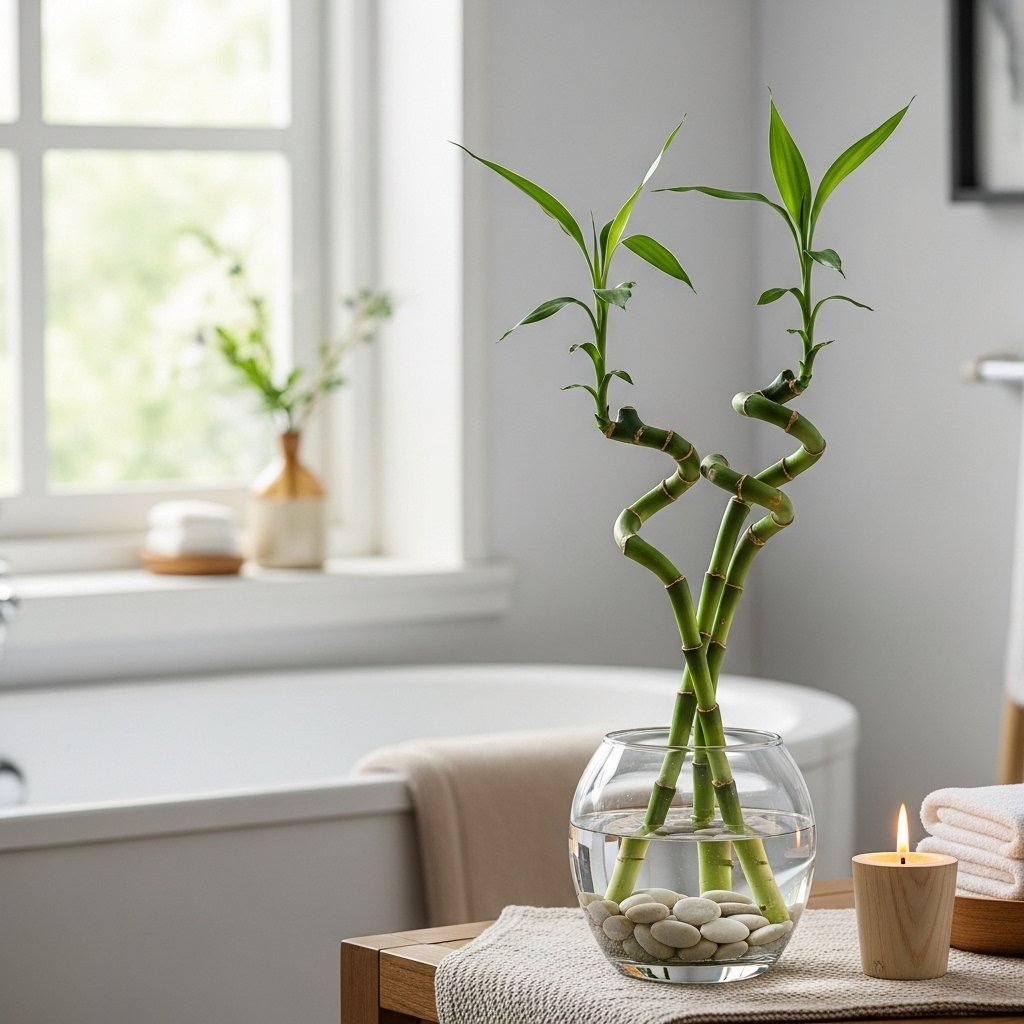 Lucky Bamboo is a popular choice for bathrooms due to its ability to grow in water and low-light conditions. It is often associated with good fortune and positive energy, making it a symbolic addition to your space. This plant is easy to maintain and can be displayed in decorative vases with pebbles and water. It thrives in indirect light and humid environments. Its elegant, minimalistic look makes it perfect for modern bathroom decor.