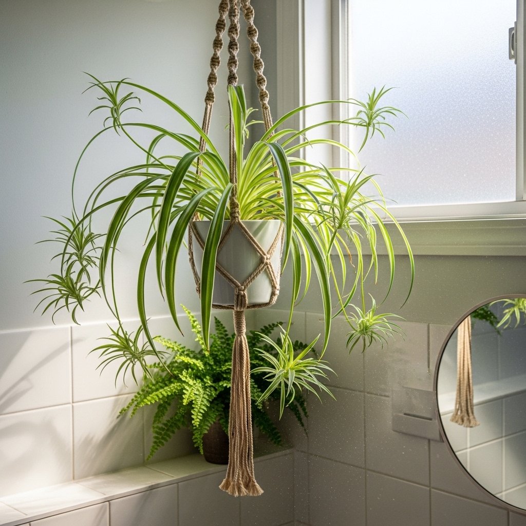 The Spider Plant is another excellent option for bathrooms because it adapts well to low light and humid conditions. Its long, arching leaves create a cascading effect that looks great in hanging planters or on shelves. This plant is also known for producing “baby” spider plants, which can be propagated easily. It helps improve air quality, making it both decorative and functional. Spider Plants are perfect for beginners due to their easy care requirements.