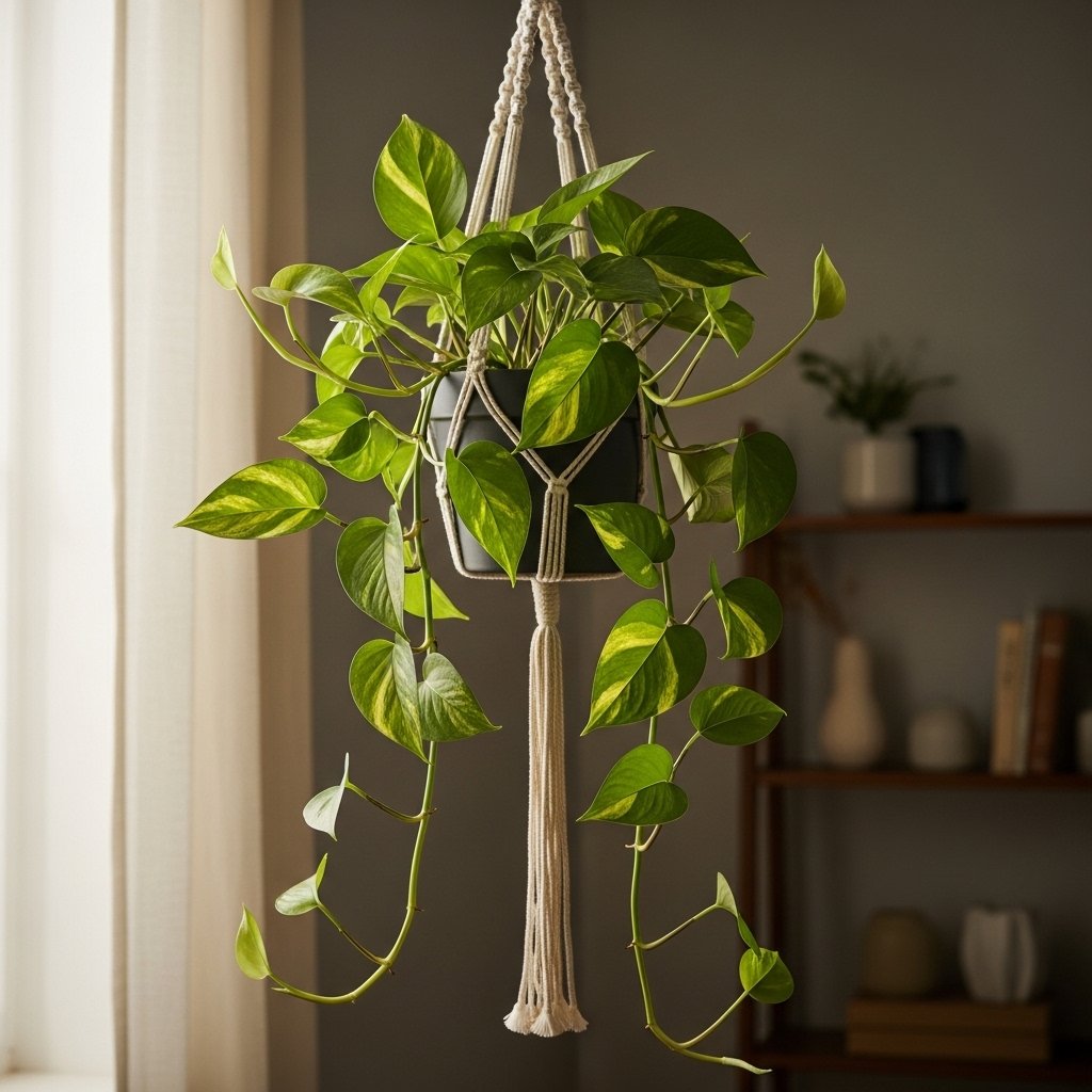 Pothos is a fast-growing trailing plant that adapts easily to low light environments. Its heart-shaped leaves come in various patterns, including green, yellow, and variegated styles. This plant is perfect for hanging baskets, shelves, or trailing down furniture for a stylish look. It requires minimal care and can tolerate occasional missed watering. Pothos is an excellent option for adding greenery without much effort.