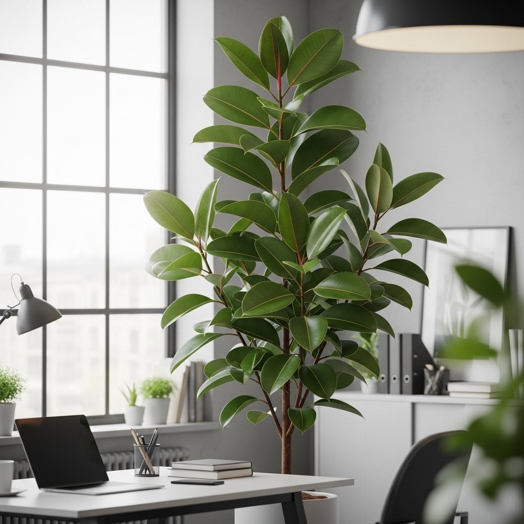 The Rubber Plant is a bold statement plant that tolerates lower light levels indoors. Its thick, glossy leaves create a strong visual impact in office spaces. While it prefers indirect light, it adapts well to moderate indoor lighting. Rubber plants require occasional watering and basic care. This plant is ideal for offices looking to add height and dramatic greenery.