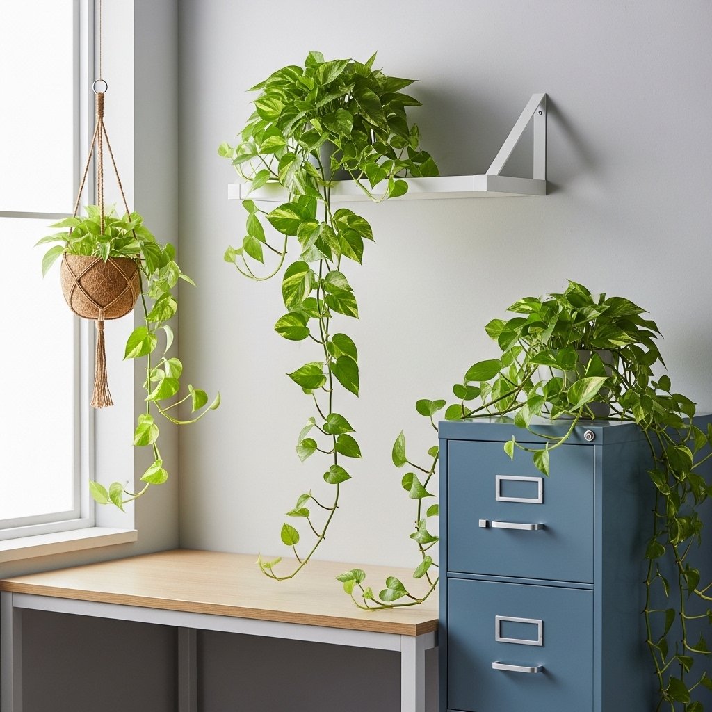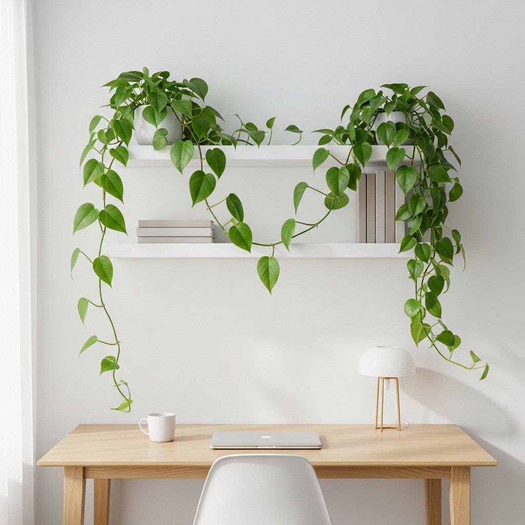 Pothos is a versatile trailing plant that thrives in low light office conditions. Its heart-shaped leaves cascade beautifully from shelves, filing cabinets, or hanging baskets. Pothos adapts well to fluorescent lighting and only needs occasional watering. It also helps improve indoor air quality while adding a touch of softness to structured office spaces. This plant is perfect for small offices where vertical greenery makes a big impact.