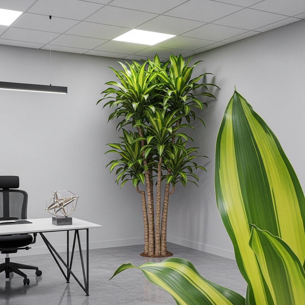Dracaena plants are popular for offices due to their striking leaf patterns and low light tolerance. They can grow tall, making them ideal for filling empty office corners. Dracaena requires minimal watering and handles fluorescent lighting effectively. Its bold appearance enhances modern office design themes. This plant combines structure and greenery for a professional atmosphere.