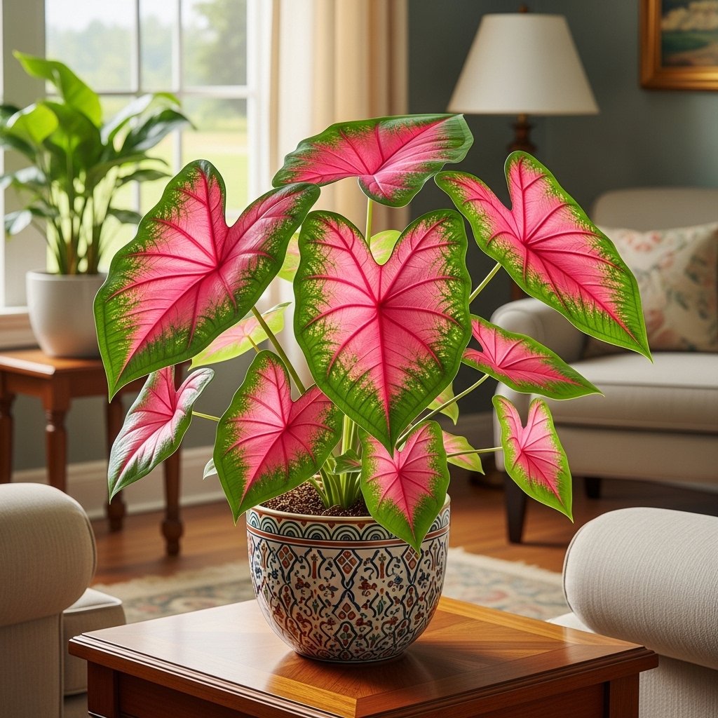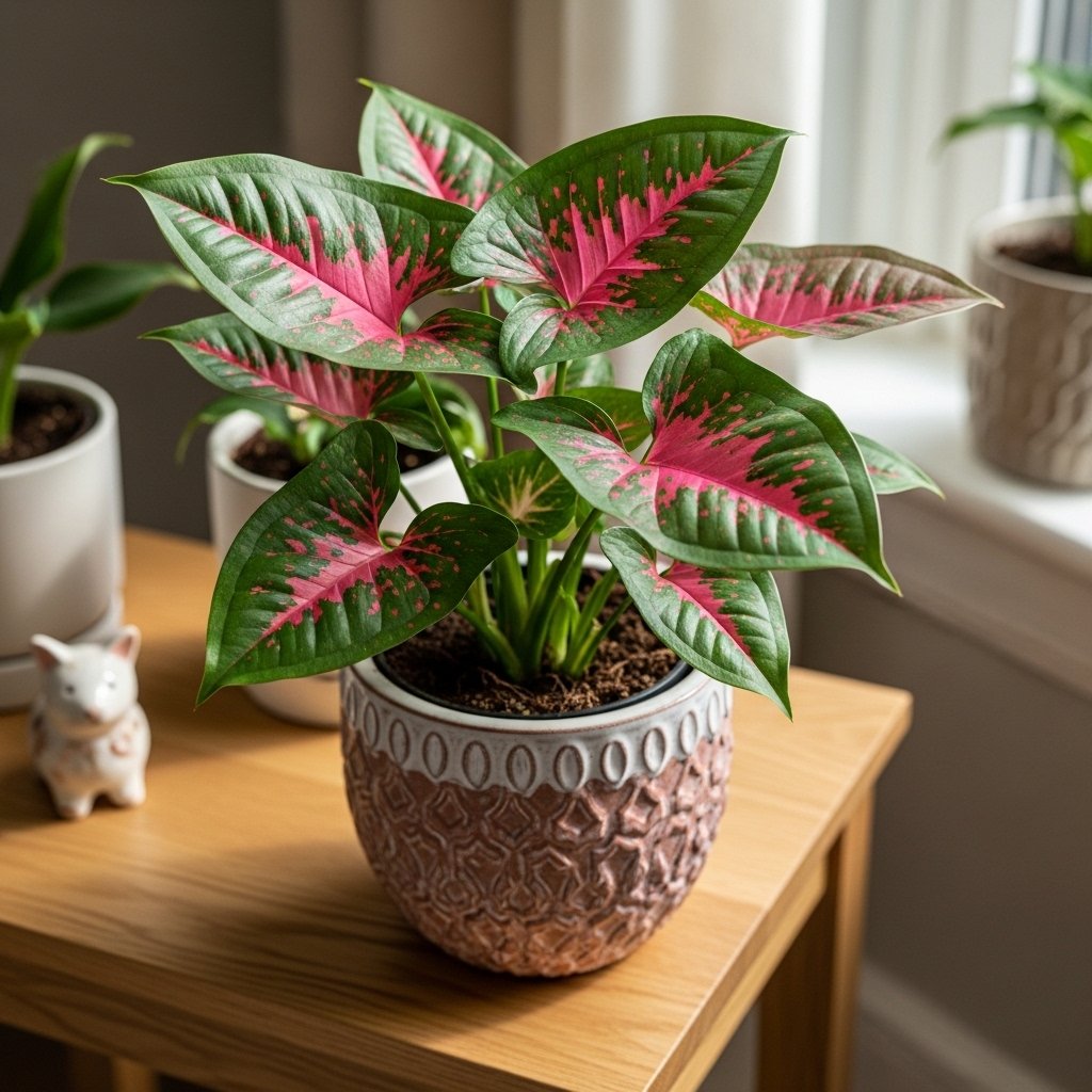 Pink Caladium is one of the most striking bright pink indoor plants you can choose for your home. Its large heart-shaped leaves feature vibrant pink centers with green edges, creating a dramatic contrast. This plant thrives in indirect sunlight and adds a tropical vibe to any room. Keeping the soil slightly moist helps maintain its lush appearance. It works beautifully as a statement plant in living rooms or entryways.