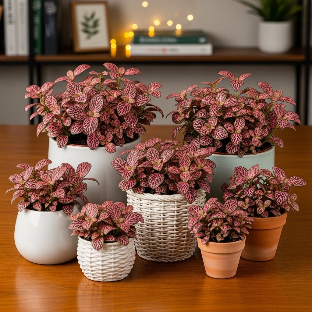 Creating a Pink Fittonia arrangement is a great way to enhance your indoor décor. These plants can be grouped together in decorative pots for a fuller and richer look. Their bright pink veins add a cohesive and stylish appearance to any arrangement. They thrive in humid conditions and indirect light. This idea is perfect for centerpieces or small decorative displays.