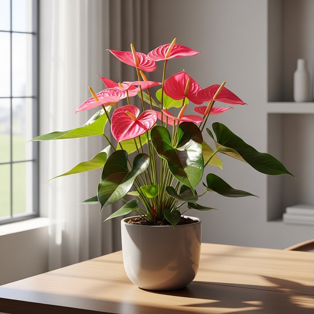 Pink Anthurium is known for its glossy leaves and bright pink heart-shaped flowers. These long-lasting blooms add a touch of elegance to any indoor space. The plant thrives in bright, indirect light and requires moderate watering. Its unique flowers make it a great centerpiece for tables or shelves. This plant is ideal for creating a sophisticated and stylish environment.