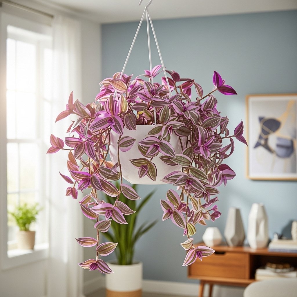 Tradescantia Nanouk is a trendy plant with pink, purple, and green striped leaves. Its trailing growth habit makes it perfect for hanging baskets or decorative pots. This plant thrives in bright light and requires well-draining soil. Regular trimming encourages fuller growth and maintains its shape. It’s a great choice for adding a modern and artistic vibe to your home.