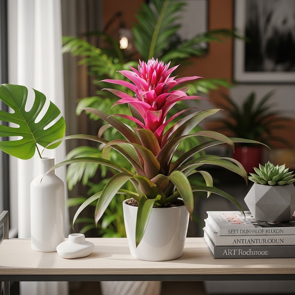 Pink Bromeliads are exotic indoor plants known for their bright pink central bracts. These plants bring a tropical feel to any room with their bold colors and unique structure. They thrive in bright, indirect light and require minimal watering. Their long-lasting blooms make them a favorite for decorative purposes. This plant is perfect for adding a splash of color to modern interiors.