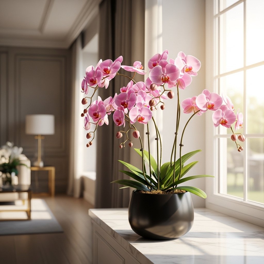 Pink Orchids are timeless indoor plants that symbolize beauty and grace. Their delicate pink flowers create a calming and elegant atmosphere in any space. These plants require proper care, including indirect light and controlled watering. Placing them near windows enhances their growth and blooming cycle. They are perfect for bedrooms, living rooms, or office spaces.
