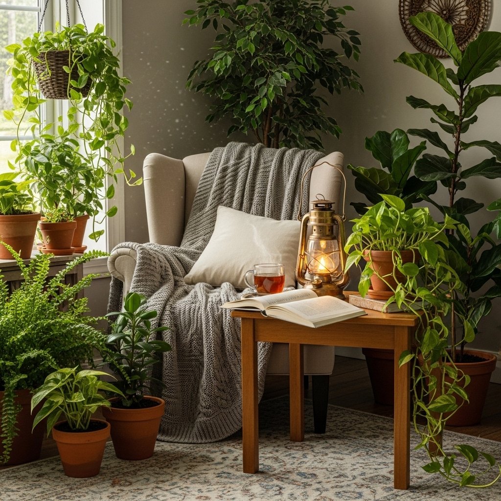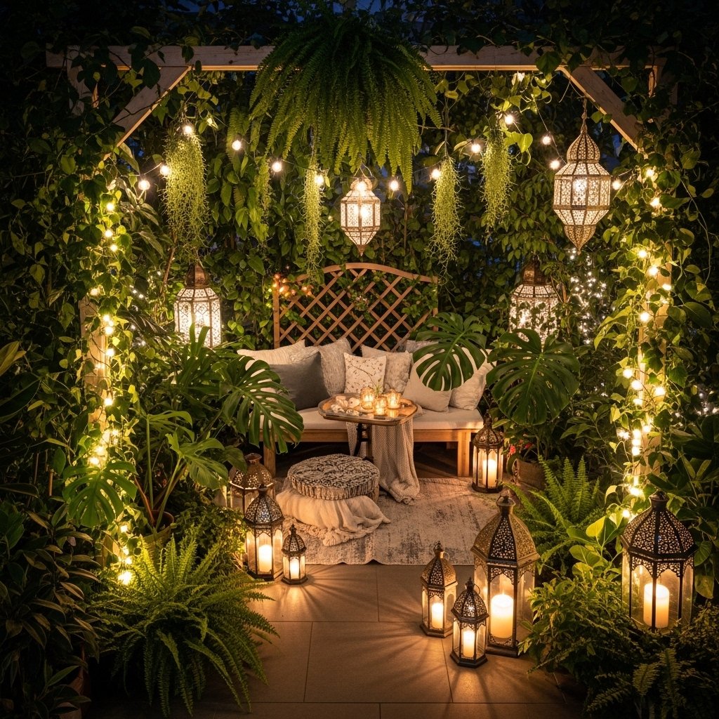 A cozy indoor garden with plants and lanterns is a small, decorated space inside your home where you combine green plants with soft lighting from lanterns. This setup creates a warm and relaxing atmosphere. The mix of natural greenery and gentle light makes the area feel peaceful, inviting, and perfect for reading, relaxing, or enjoying a quiet evening.