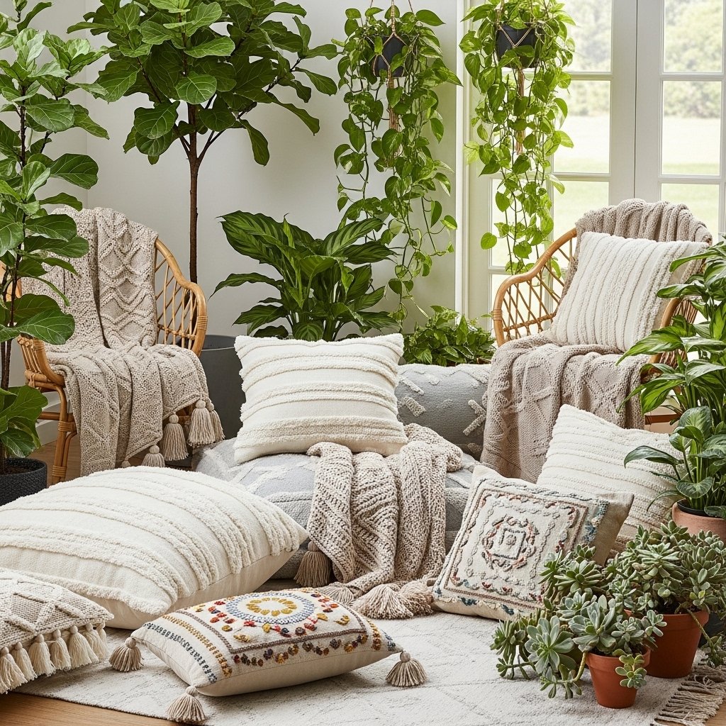 Soft textiles help make your indoor garden feel more comfortable and livable. Add cushions, floor pillows, or a knitted throw near your plant area. Choose neutral or earthy tones like beige, cream, or olive green. These fabrics balance the freshness of plants with cozy warmth. This makes the space ideal for relaxing, reading, or meditation.