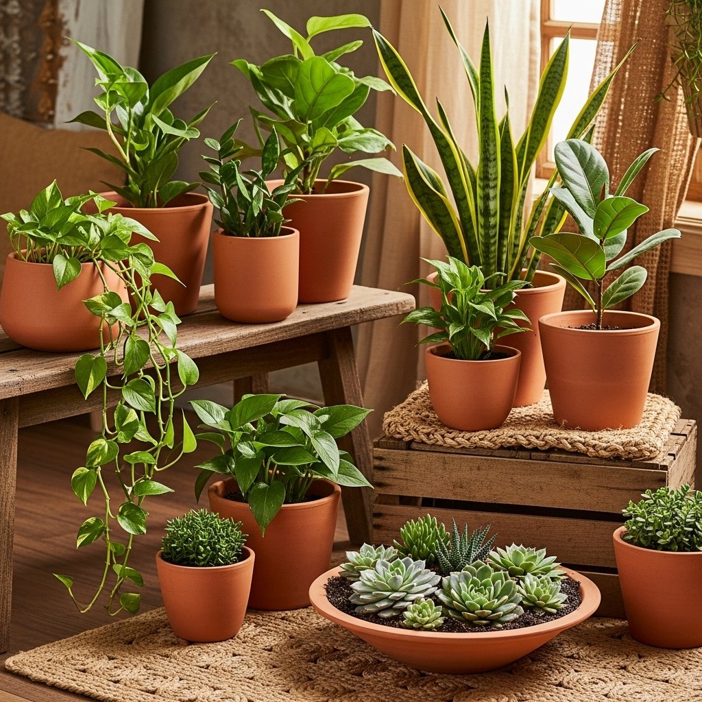 Terracotta pots are ideal for a natural and earthy indoor garden style. Their warm orange-brown color contrasts beautifully with green plants. Arrange different sizes together to create a layered look. These pots also help maintain healthy soil conditions for plants. Combined with lantern lighting, they enhance the rustic cozy vibe.