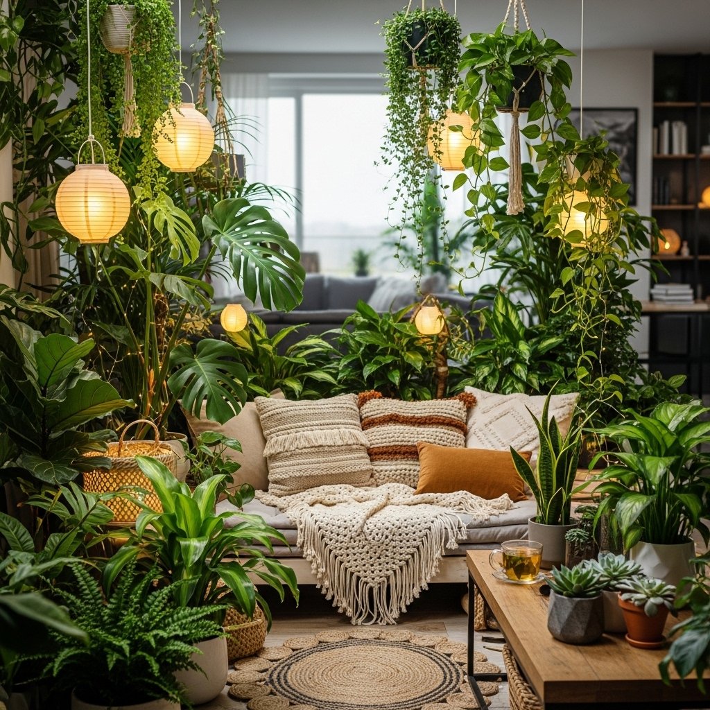 Cozy Indoor Garden with Plants and Lanterns: A Warm and Relaxing Home Escape