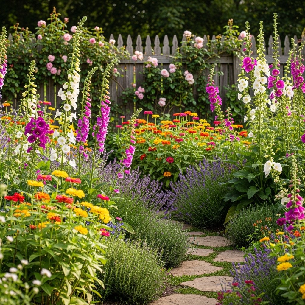 A cottage-style cut flower garden brings a relaxed and charming look to your yard. This design features a mix of tall and short flowers, layered to create an informal, whimsical feel. Flowers like foxgloves, hollyhocks, and zinnias add height and color variety. Interplanting with fragrant herbs like lavender or thyme enhances both beauty and scent. This design is perfect for gardeners who love a natural, overflowing look while still providing abundant blooms for cutting.