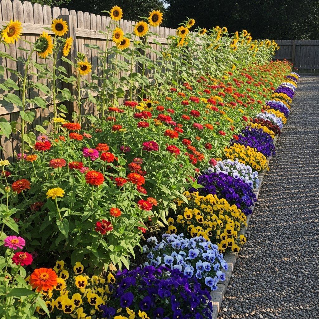 Mixed-height flower borders are ideal for creating depth and visual interest in a cut flower garden. Plant taller flowers like sunflowers or hollyhocks at the back, medium-height blooms like zinnias in the middle, and low-growing flowers like pansies at the front. This technique ensures that all flowers are visible while allowing easy access for harvesting. Combining colors and textures enhances the aesthetic appeal. Borders like these work well along fences, pathways, or garden edges.