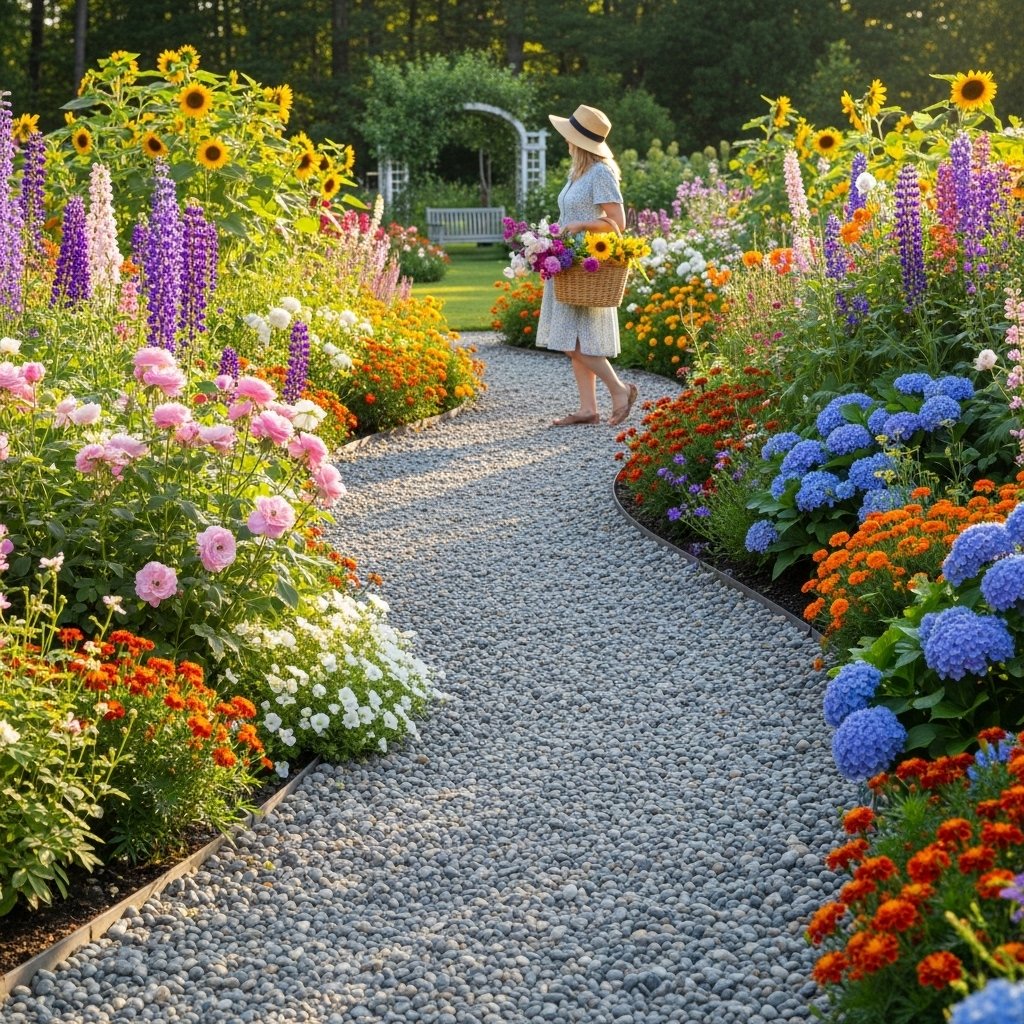 A pathway-style cut flower garden combines beauty with accessibility. Creating small walking paths between flower beds allows you to move easily through the garden while harvesting blooms. Gravel, stepping stones, or brick paths add charm and functionality to the landscape design. Flowers planted along both sides of the path create a lush tunnel of color and fragrance. This layout is perfect for larger gardens where organization and easy access are important.