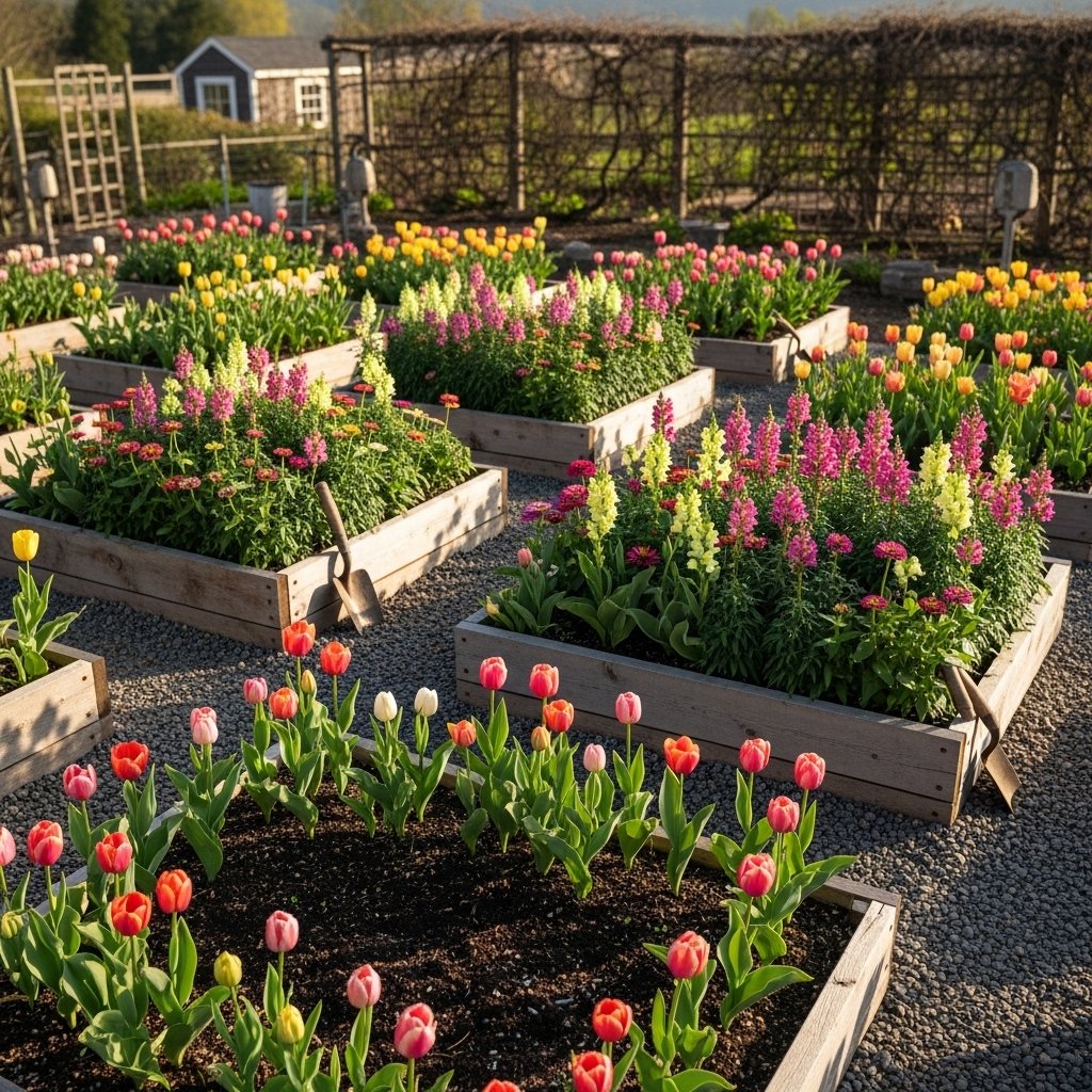 Raised beds are one of the most efficient layout options for a cut flower garden in zone 6b. They warm up faster in spring, allowing you to plant hardy annuals earlier than in-ground beds. Standard 4×8-foot raised beds make it easy to reach flowers without stepping on soil, preserving structure and drainage. Organizing flowers by height—tall in the back, medium in the middle, and short in the front—keeps harvesting simple and visually pleasing. This layout works especially well for tulips, zinnias, snapdragons, and cosmos.