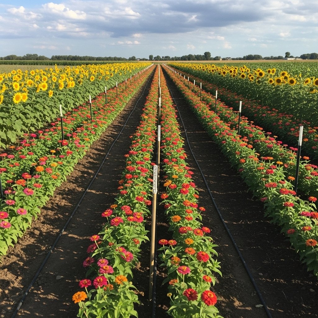 A straight row layout is ideal for gardeners focused on maximizing stem production. Inspired by small-scale flower farms, this method uses long rows with consistent spacing for easy harvesting and maintenance. In zone 6b, rows should run north to south to ensure even sunlight exposure. This layout simplifies succession planting, especially for quick growers like sunflowers and zinnias. Drip irrigation lines can be installed along each row for efficient watering during hot summers.