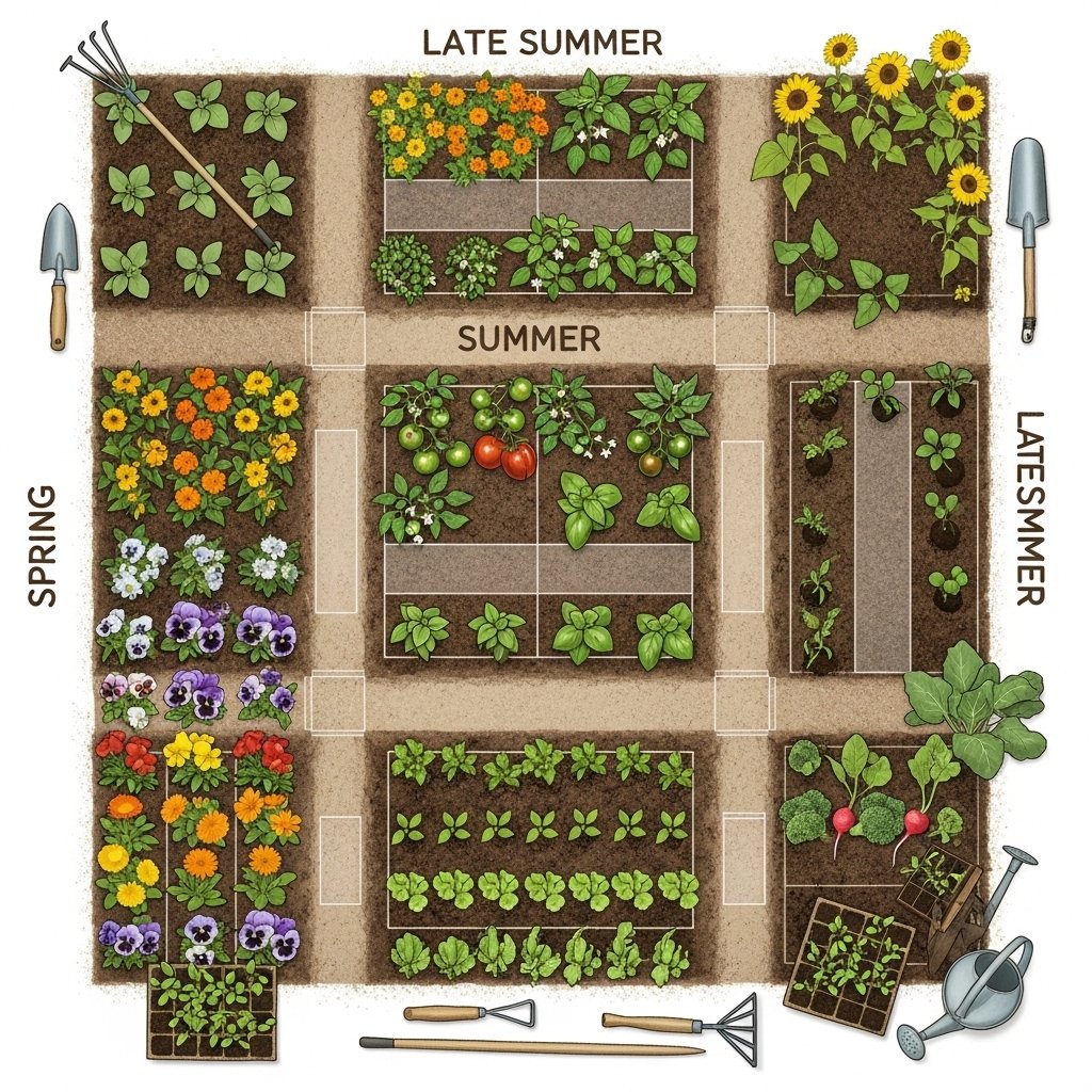 A four-season layout focuses on year-round structure even in colder climates like zone 6b. Start with spring bulbs, transition to summer annuals, and incorporate fall-blooming flowers for extended harvest. Leaving space for overwintering hardy plants ensures strong regrowth the following year. Planning with seasonal transitions in mind prevents empty beds and wasted space. This layout supports continuous beauty and efficient garden management.