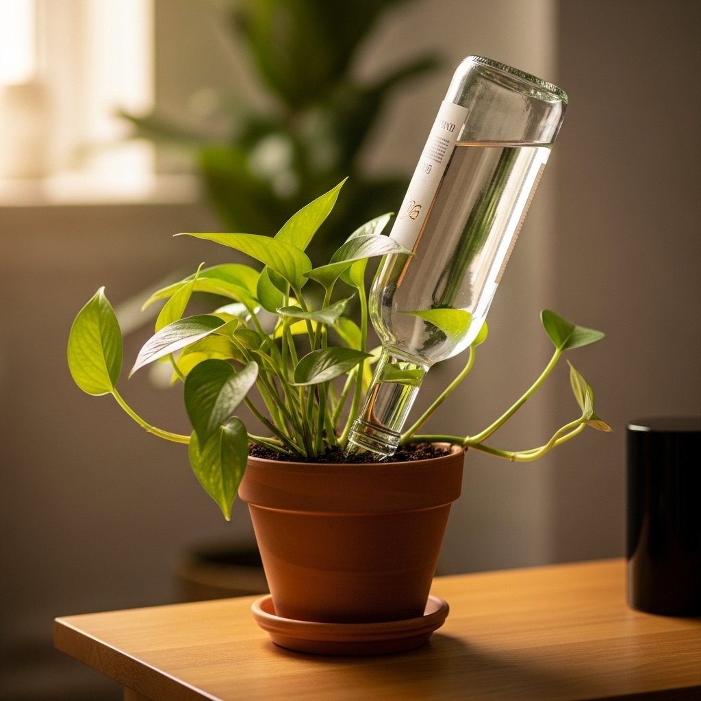 Repurpose an empty wine bottle as a stylish watering system. Fill the bottle with water and insert it upside down into the soil, similar to the plastic bottle method. The narrow neck controls the water flow, making it slow and steady. This method works well for decorative indoor setups. It adds both functionality and aesthetic appeal to your plant display.