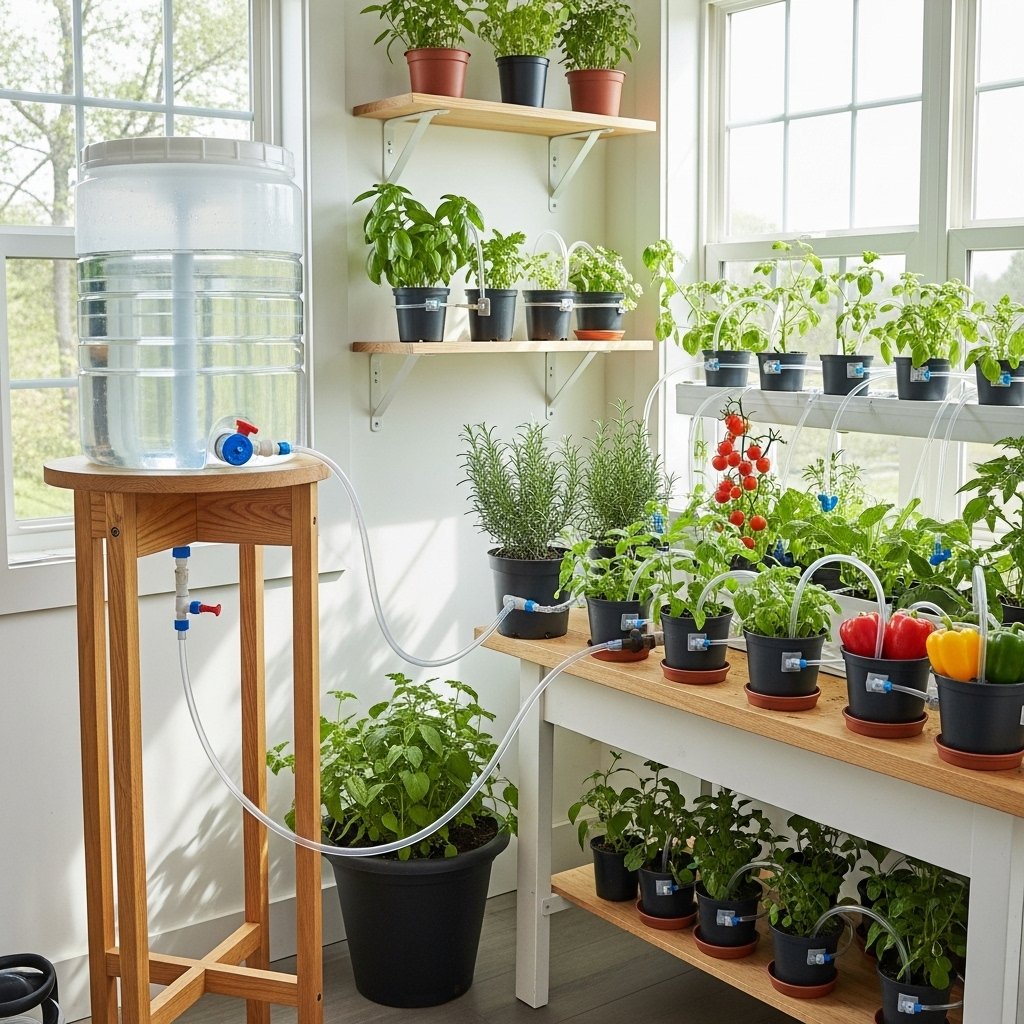 A gravity-fed system uses a raised water container to supply water through tubes to your plants. The elevated position allows water to flow naturally without electricity. You can control the flow using clamps or valves. This setup is ideal for watering multiple plants simultaneously. It’s a great solution for larger indoor plant setups.