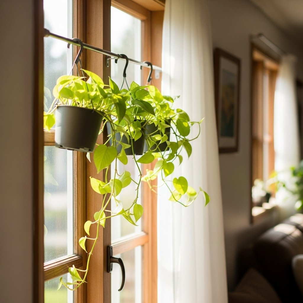 Window frames are one of the best spots for hanging plants because they provide natural sunlight. You can install rods or hooks directly above the window to hang lightweight pots. This allows plants to grow toward the light while enhancing the window view. It also adds privacy without blocking natural light completely. This idea is perfect for bright and airy interiors.