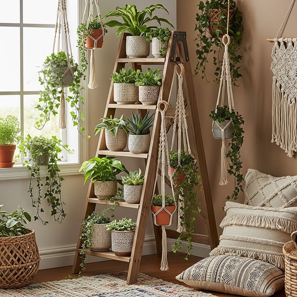 A wooden ladder used as a hanging plant stand is a creative and rustic decor idea. You can hang small pots on each step or side of the ladder. This setup works well in empty corners that need a decorative touch. It is easy to move and rearrange depending on your space. This idea blends functionality with aesthetic charm.