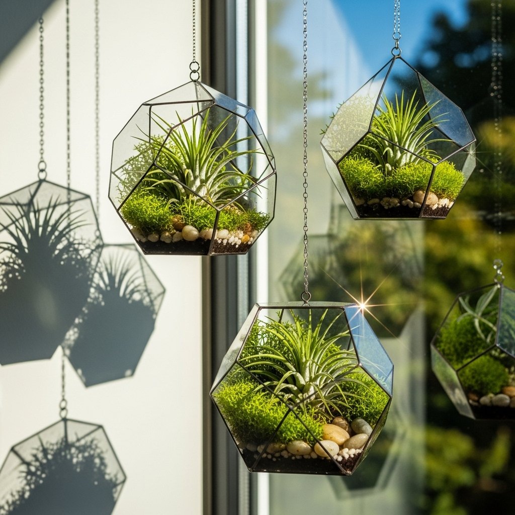 Hanging glass terrariums are a stylish and elegant way to showcase small indoor plants. These transparent globes or geometric shapes allow you to create mini ecosystems with moss, succulents, or air plants. They look especially beautiful when hung near windows where sunlight can pass through the glass. This idea adds a delicate and artistic touch to your home decor. It is perfect for modern and minimalist interiors.