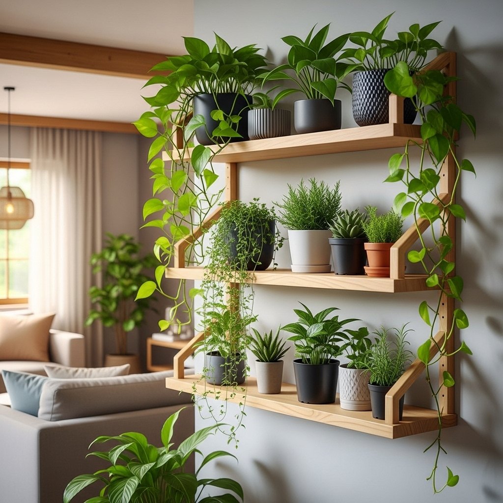 Wall-mounted shelves designed for hanging plants are a great way to combine structure with greenery. These shelves allow you to display multiple plants in a vertical arrangement, saving floor space. You can choose wooden shelves for a natural look or metal shelves for a modern industrial vibe. Mixing different plant sizes creates a balanced and visually appealing display. This idea works well in living rooms, hallways, or offices.