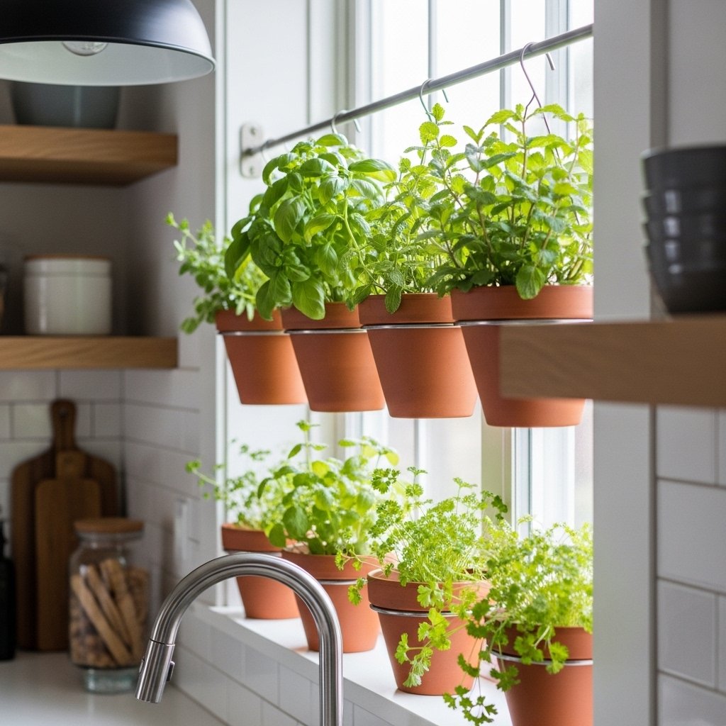 A hanging kitchen herb garden is both decorative and practical for cooking enthusiasts. You can grow herbs like basil, mint, parsley, and cilantro in small hanging pots. Placing them near a kitchen window ensures they receive enough sunlight to thrive. This setup not only saves counter space but also keeps fresh herbs within easy reach. It adds a fresh and aromatic atmosphere to your cooking space.