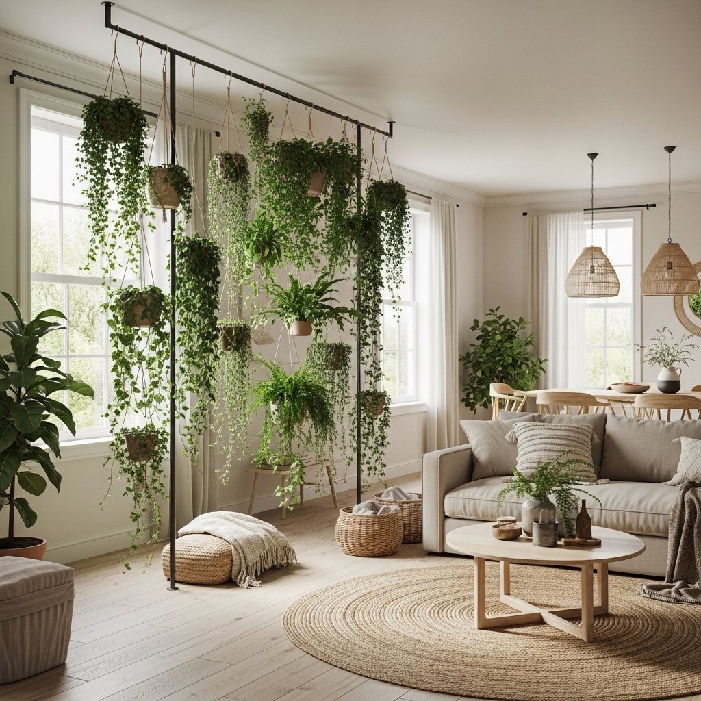 Using hanging plants as a room divider is a creative way to separate spaces without building walls. You can hang multiple plants in a row using a rod, wooden frame, or metal structure. This creates a natural green partition that feels light and airy. It works especially well in studio apartments or open-plan living areas. This idea enhances privacy while maintaining an open and fresh environment.