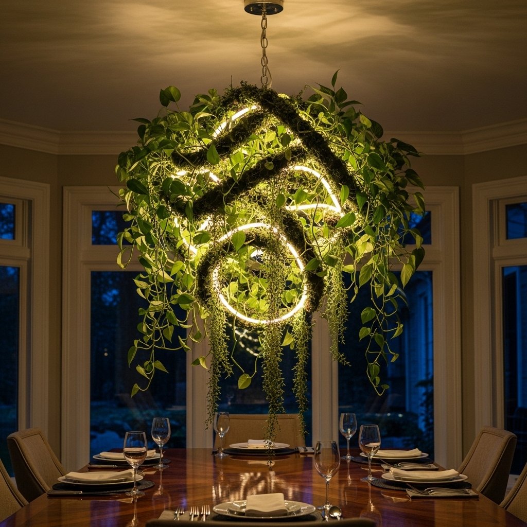 Hanging plant chandeliers are a bold and artistic way to decorate your indoor space. Instead of traditional lights, you can create a chandelier structure filled with cascading plants. This design becomes a stunning focal point in dining rooms or living spaces. It combines natural beauty with creative interior styling. This idea is perfect for those who love statement decor pieces.