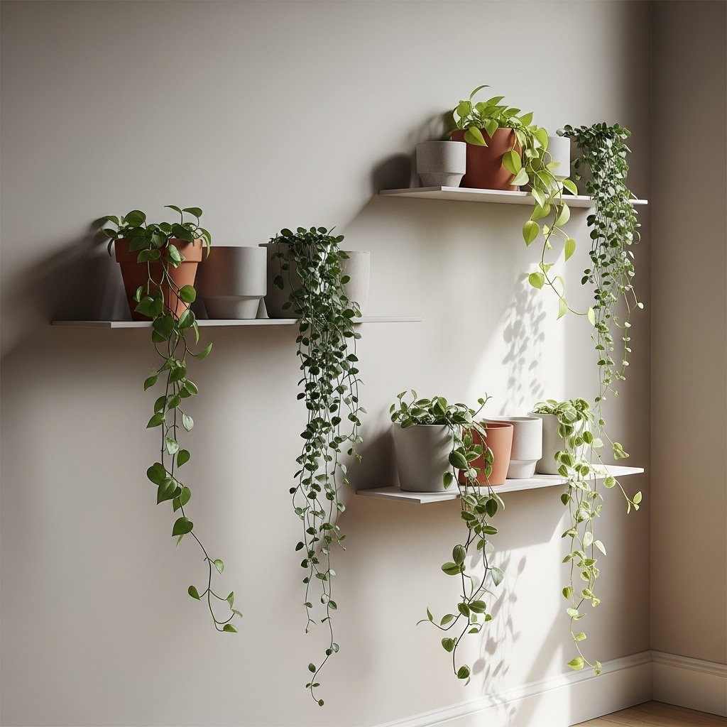 Floating shelves combined with hanging plants create a modern and layered decor effect. You can place small pots on shelves while allowing trailing plants to hang down naturally. This creates a waterfall-like greenery effect that looks elegant and dynamic. It works best on empty walls that need visual enhancement. This idea is simple yet highly stylish for contemporary homes.