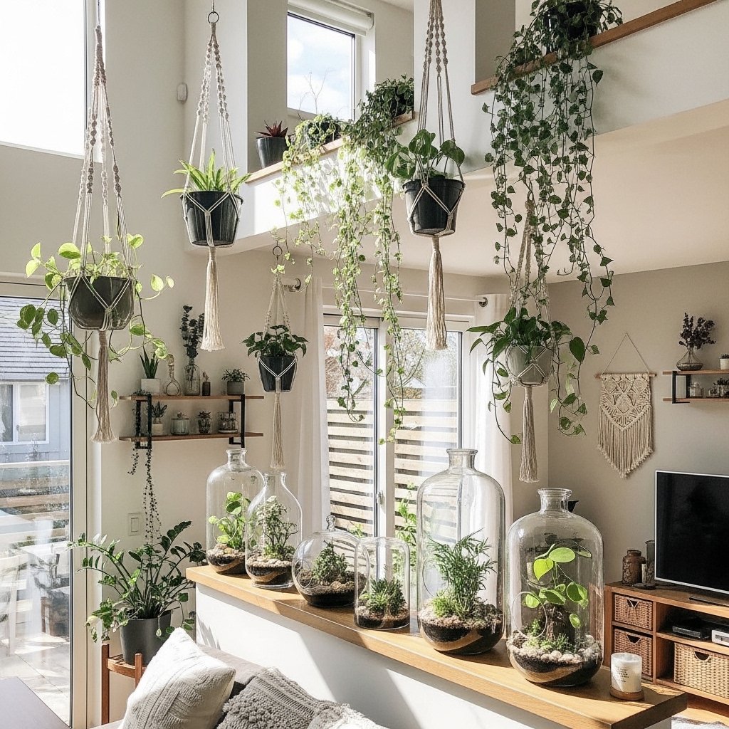 A mixed cluster display involves hanging several plants together at different heights and styles. You can combine pots, baskets, and terrariums to create a rich and layered look. This setup adds depth and visual interest to plain walls or ceilings. It works best in spacious rooms where plants can be showcased freely. This idea is perfect for plant lovers who want a lush indoor jungle feel.
