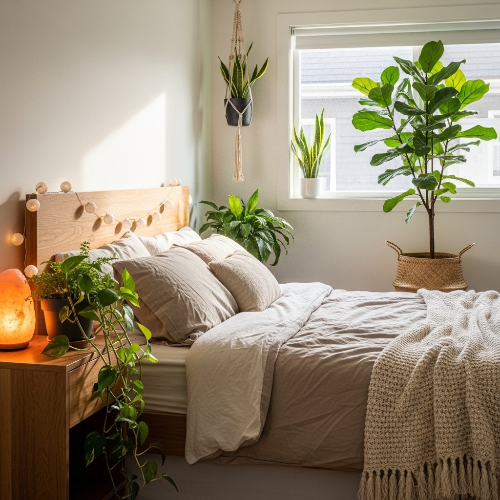 Incorporating indoor plants into bedroom decor creates a calm and peaceful environment. Plants like snake plants and lavender are known for their relaxing properties. Place them on bedside tables, shelves, or corners to enhance the room’s ambiance. Soft green tones pair well with neutral bedding and decor styles. This idea promotes better relaxation while making your bedroom look fresh and inviting.