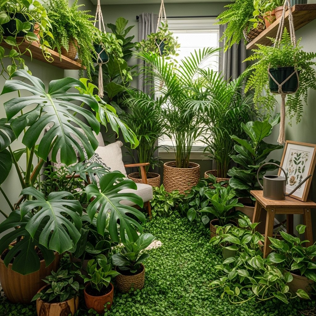 A mini indoor jungle is perfect for plant lovers who want a bold and vibrant look. Fill a room with a variety of leafy plants such as ferns, palms, and monstera to create a dense green environment. Layer plants on the floor, shelves, and hanging spaces to achieve a jungle-like effect. This setup creates a refreshing and lively atmosphere that feels close to nature. It works especially well in living rooms or sunrooms with good natural light.