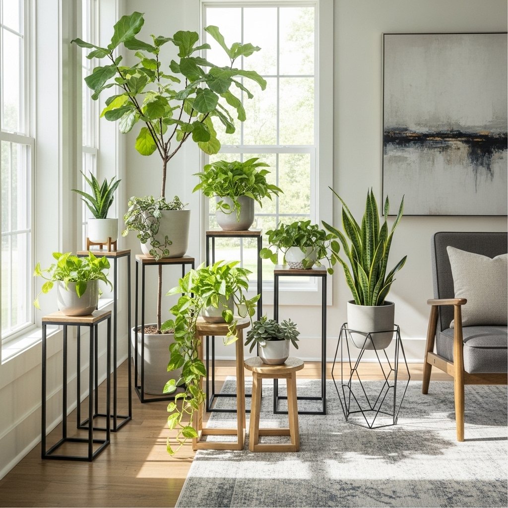 Plant stands help elevate your indoor plants and make them more visually prominent. Using stands of different heights adds dimension and prevents the arrangement from looking flat. Wooden or metal stands can complement your existing furniture and decor style. This idea is perfect for highlighting statement plants like fiddle leaf figs or snake plants. It also makes cleaning and watering easier by keeping plants off the floor.