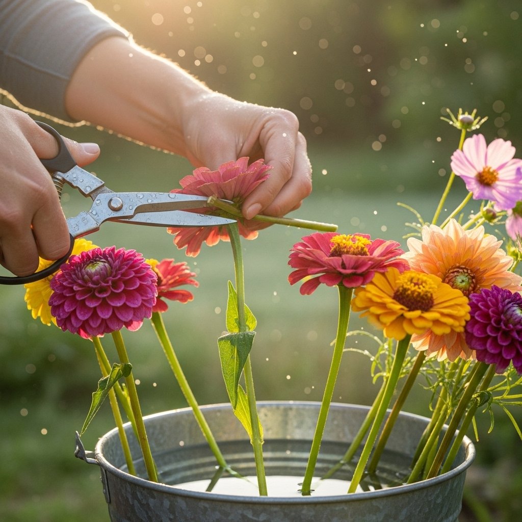 Harvesting flowers properly encourages plants to continue producing blooms. Cut flowers early in the morning when stems are fully hydrated and temperatures are cooler. Use sharp, clean shears to prevent damage and disease transmission. Cut stems at an angle and immediately place them in water to maintain freshness. Regular harvesting actually stimulates many varieties to produce more flowers.