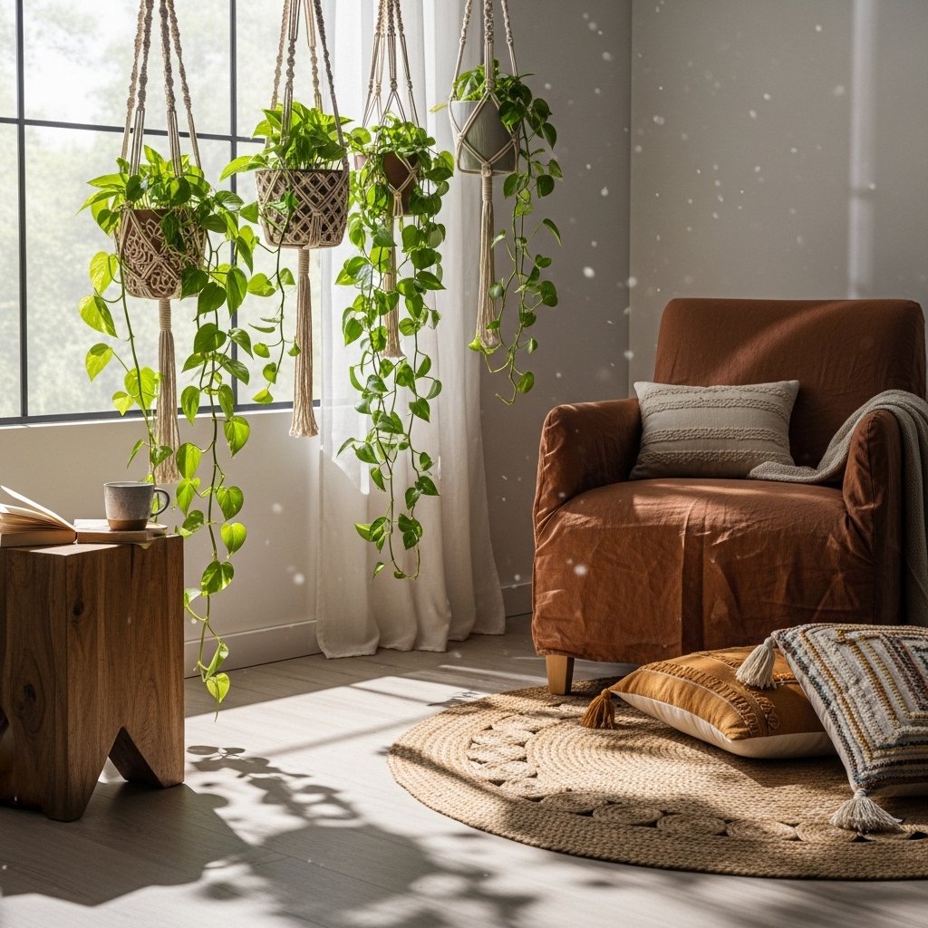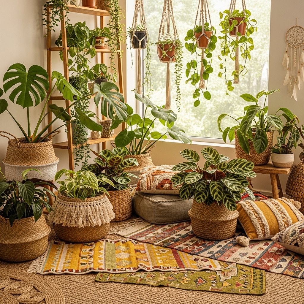 A boho-style plant corner near the living room window combines plants with cozy textures and earthy tones. Use woven baskets, macrame hangers, and wooden stands to display your plants. Add plants like monstera, peace lily, and calathea to complete the bohemian look. Layer rugs, cushions, and soft lighting to enhance the overall ambiance. This idea creates a warm, relaxed, and artistic environment.