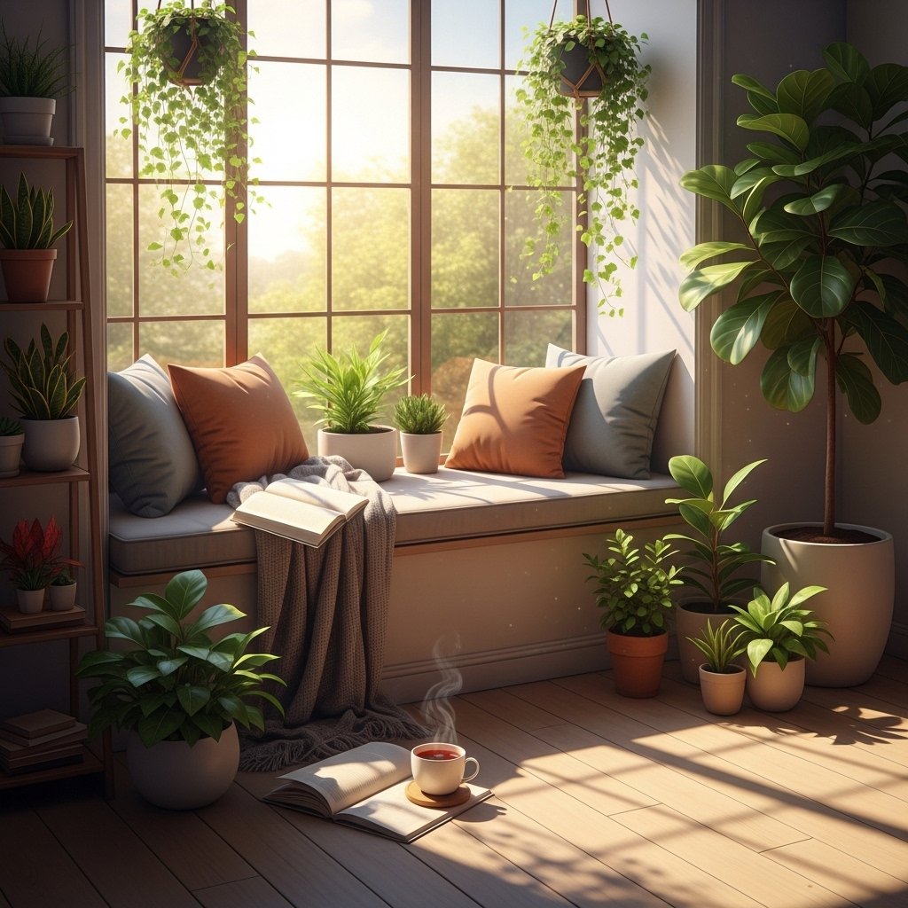 A window bench combined with plants creates a cozy and functional living room corner. You can place plants along the bench or on the sides to frame the seating area. Adding cushions and throws makes the space perfect for relaxation. This setup allows you to enjoy natural light while surrounded by greenery. It’s ideal for reading, relaxing, or enjoying a peaceful moment.
