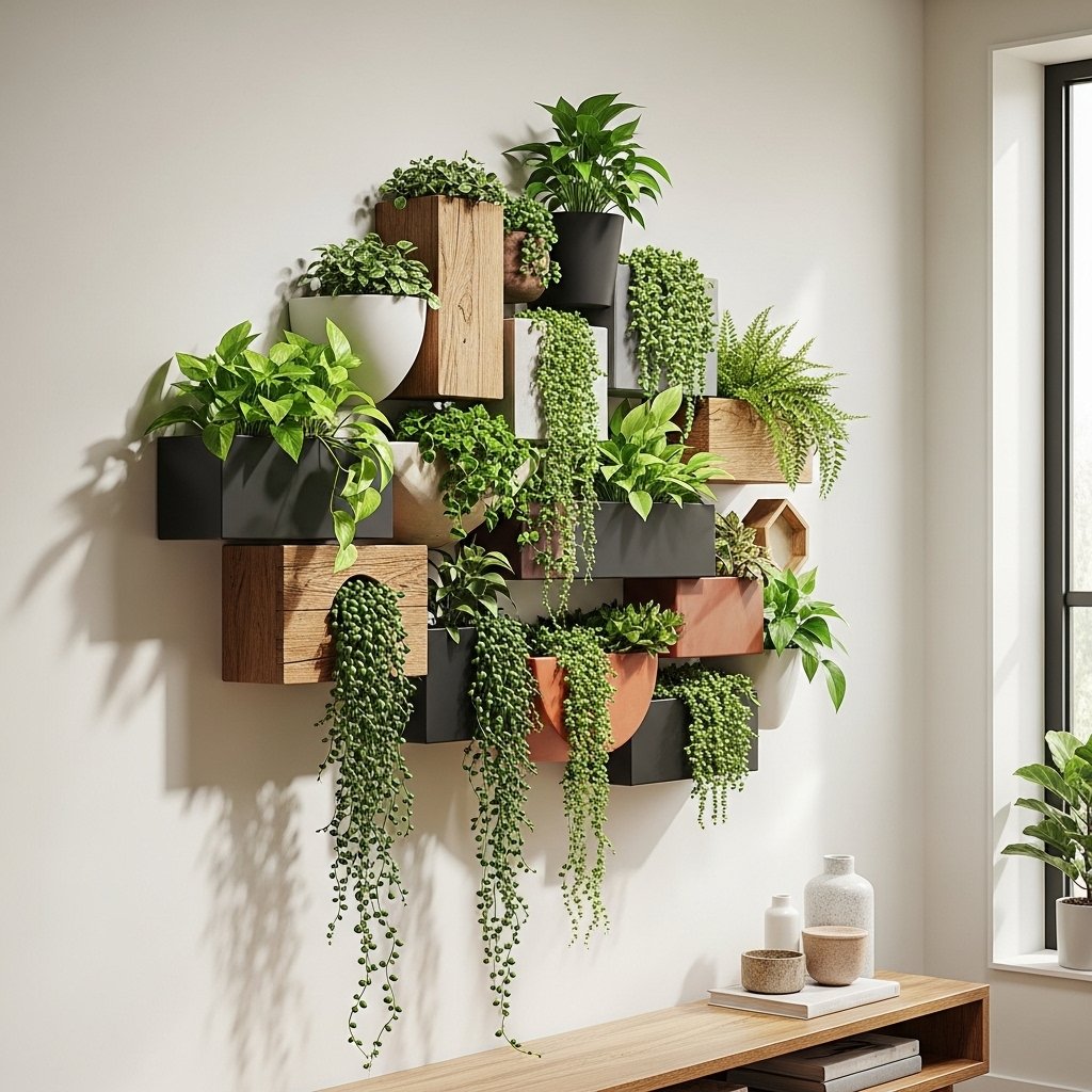 Wall-mounted planters are perfect for adding greenery without using floor space. Vertical gardens or mounted pots can transform plain walls into living art installations. These setups are ideal for hallways, kitchens, or above desks, creating a green feature wall. Mixing trailing plants with small foliage plants creates texture and visual appeal. Wall-mounted planters are not only decorative but also practical for maximizing limited space creatively.