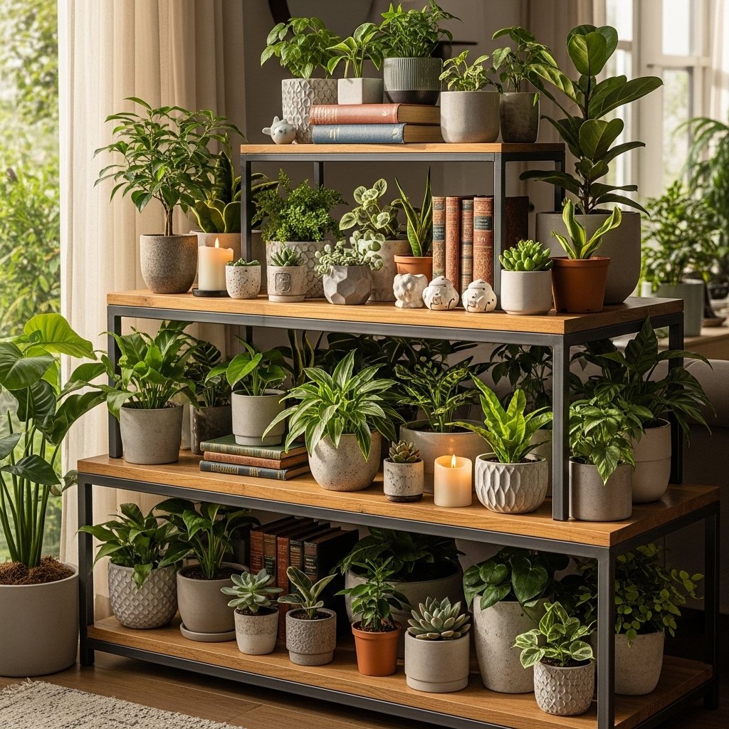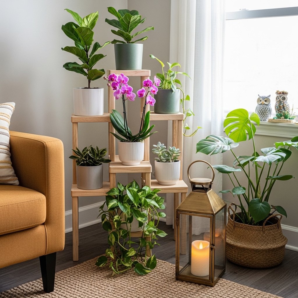 Plant stands are a versatile solution for displaying indoor plants without crowding the floor. Multi-tiered stands allow you to arrange multiple pots vertically, adding dimension to your plant decor. Using stands with varying heights gives a dynamic look, perfect for living rooms, bedrooms, or entryways. Combining plants with decorative items like lanterns or figurines enhances visual appeal. This setup creates a designated plant corner that looks curated and stylish.
