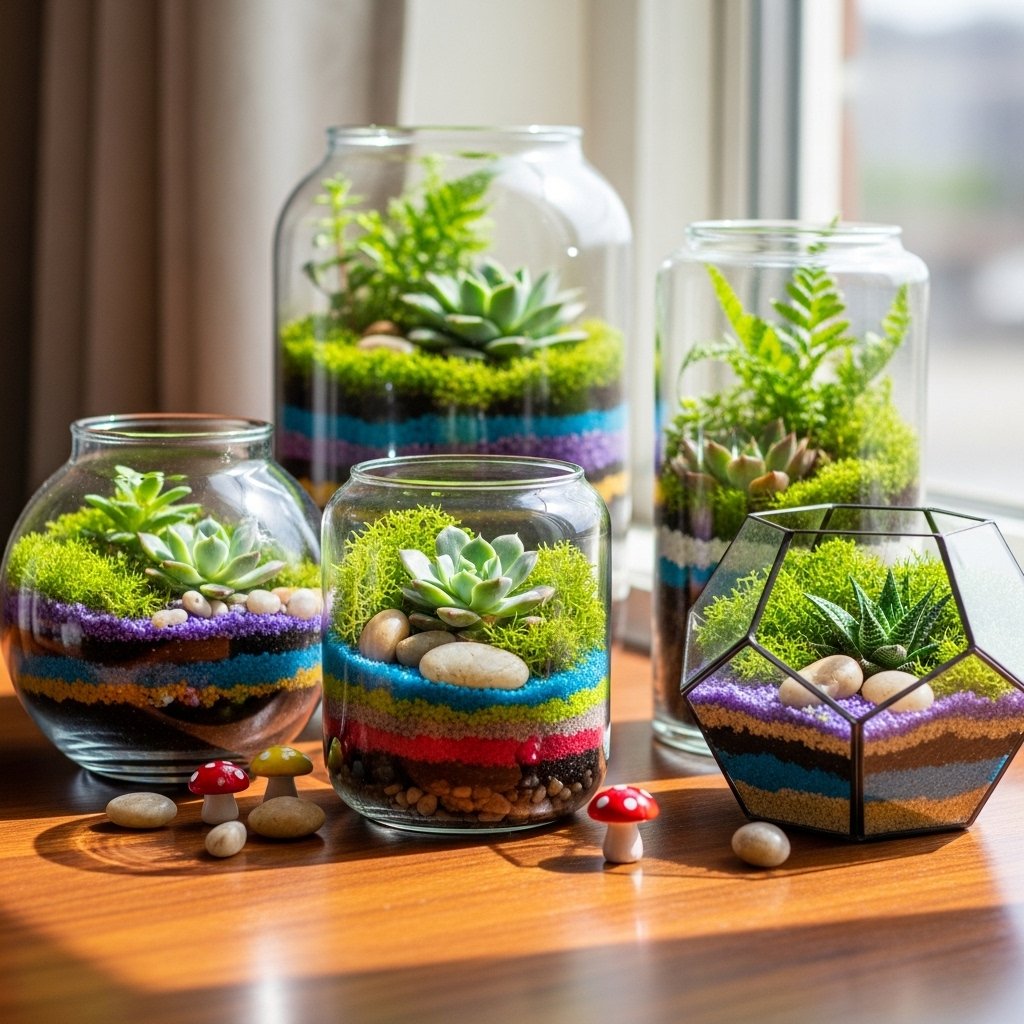 Terrariums and glass containers offer a creative way to display indoor plants while keeping maintenance low. Succulents, moss, and small ferns look stunning in clear glass jars, bowls, or geometric terrariums. These arrangements allow you to see the soil, rocks, and layers, adding texture and dimension to your decor. Terrariums are compact, perfect for desktops, shelves, or coffee tables. They combine natural beauty with artistic presentation, making them ideal conversation pieces.