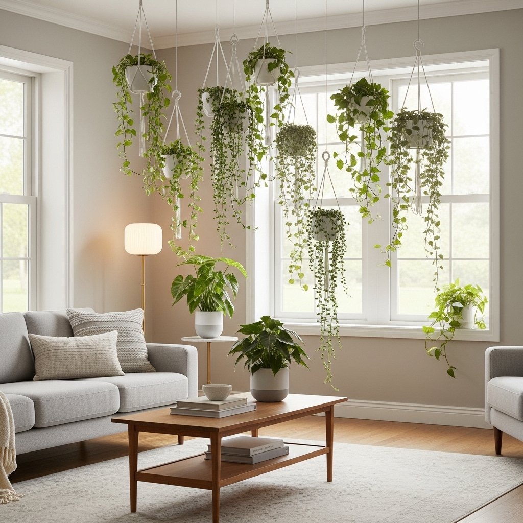 Hanging plants bring a soft and elegant vibe to any living room. They help utilize vertical space while adding movement and texture to the decor. Choosing sleek hanging planters in neutral tones keeps the look refined and modern. Trailing plants like pothos or ivy create a cascading effect that feels luxurious. This idea works especially well in smaller spaces where floor space is limited.