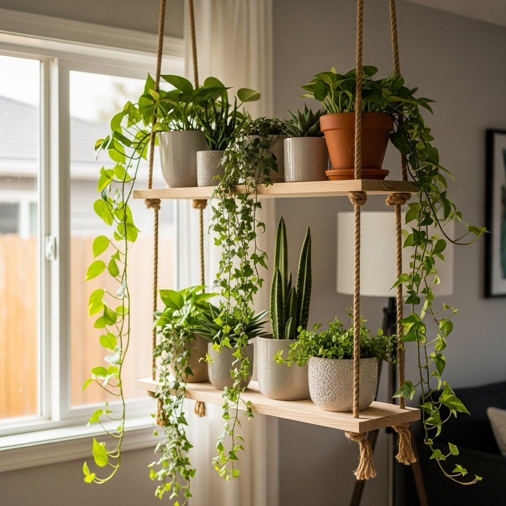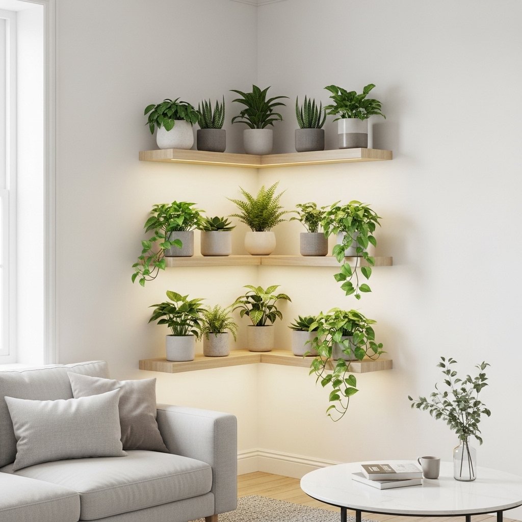 Floating corner shelves are an excellent way to utilize unused spaces in your living room. These DIY shelves can be installed easily and provide a neat platform for displaying plants. Corner arrangements help create a cozy green nook without cluttering the room. Small to medium-sized plants work best for this setup. This idea enhances both functionality and aesthetic balance in your space.